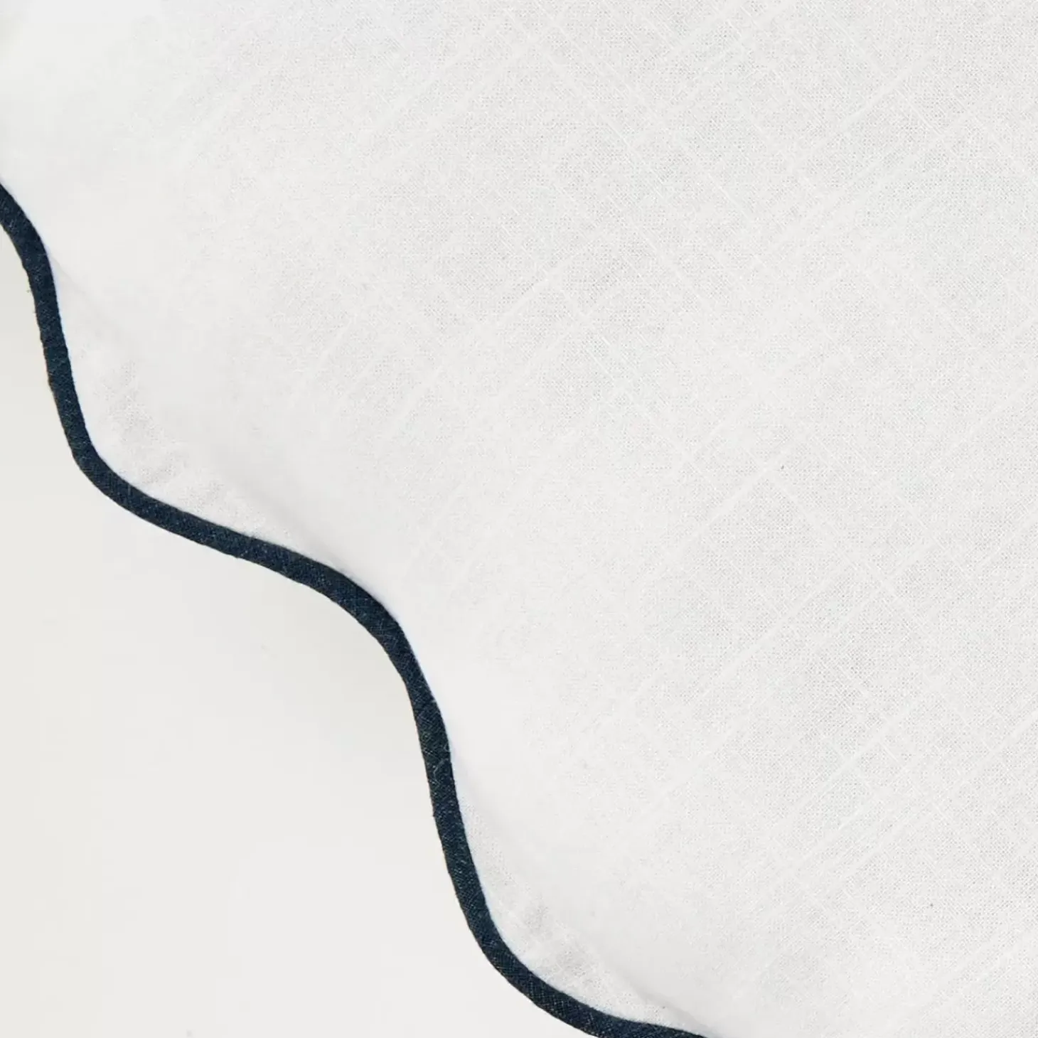 A Delicate Scalloped Edge Is An Easy Way To Add A Unique Twist To Classic Interior Pieces Like This White Cotton Accent Cushion With Scalloped, Navy Trim For A Hamptons Chic Aesthetic.