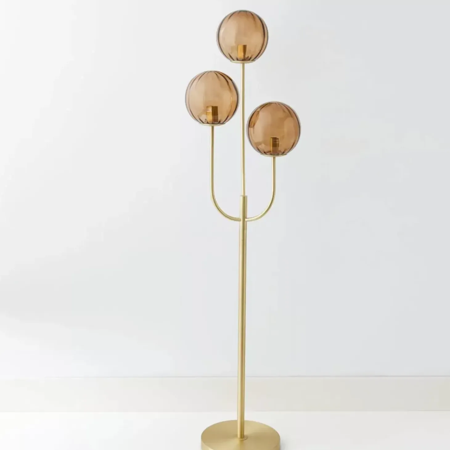 Ideal For Adding Some Stylish Illumination To Any Living Space, The Trident Metal Floor Lamp Is Made From High-Quality Metal With A Stylish Gold Matte Finish, Supporting Three Orb-Shaped Amber Tinted Glass Baubles For Maximum Light.