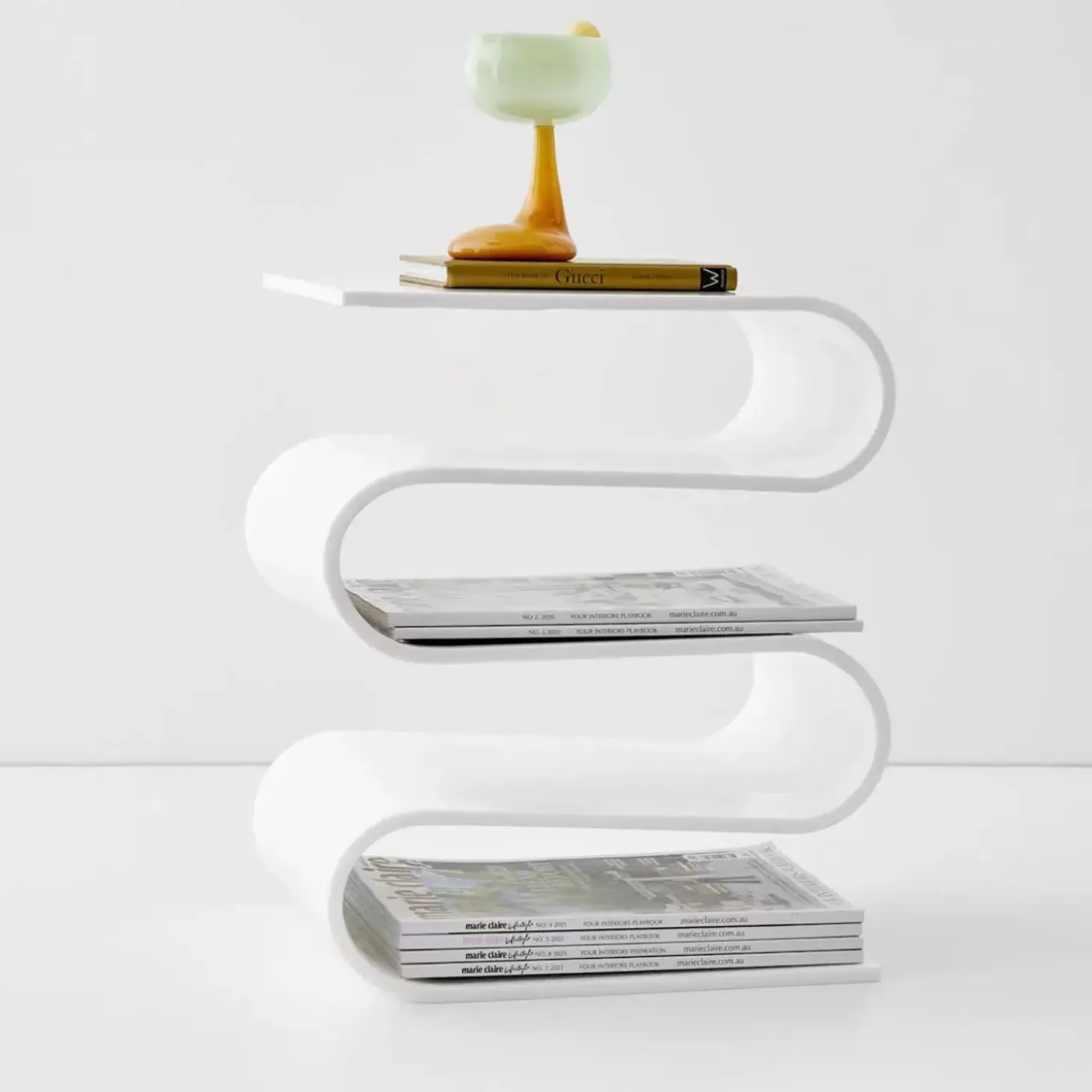 This Mind-Bendingly Clever Design Side Table Is Full Of Storage Options Between It’S Multiple ”S” Bends. The Shiny, Opaque White Acrylic Pops When Paired With Metallic Décor.